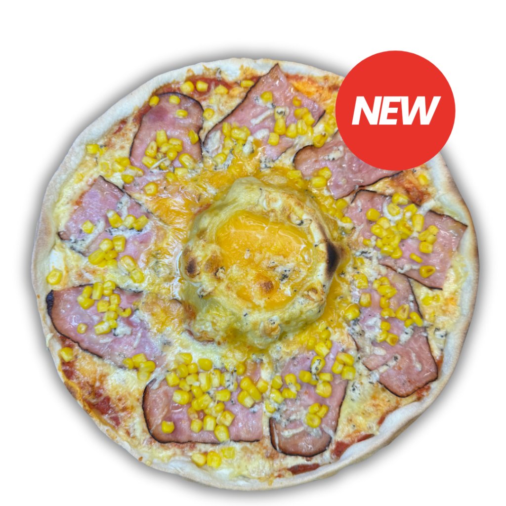 naše pizza Angličák s kráterem roztaveného teplého sýra uprostřed