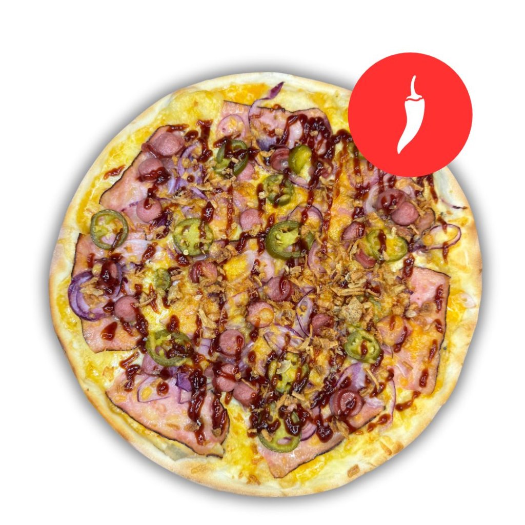 sýr, slanina, párek, červená cibule, smažená cibulka, jalapeňos, čedar a BBQ omáčka