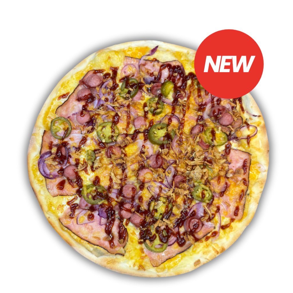 sýr, slanina, párek, červená cibule, smažená cibulka, jalapeňos, čedar a BBQ omáčka